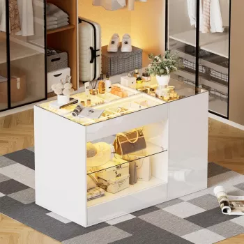 Makeup Vanity Storage Island with Glass Top & LED Lighting, Closet Island with Drawers